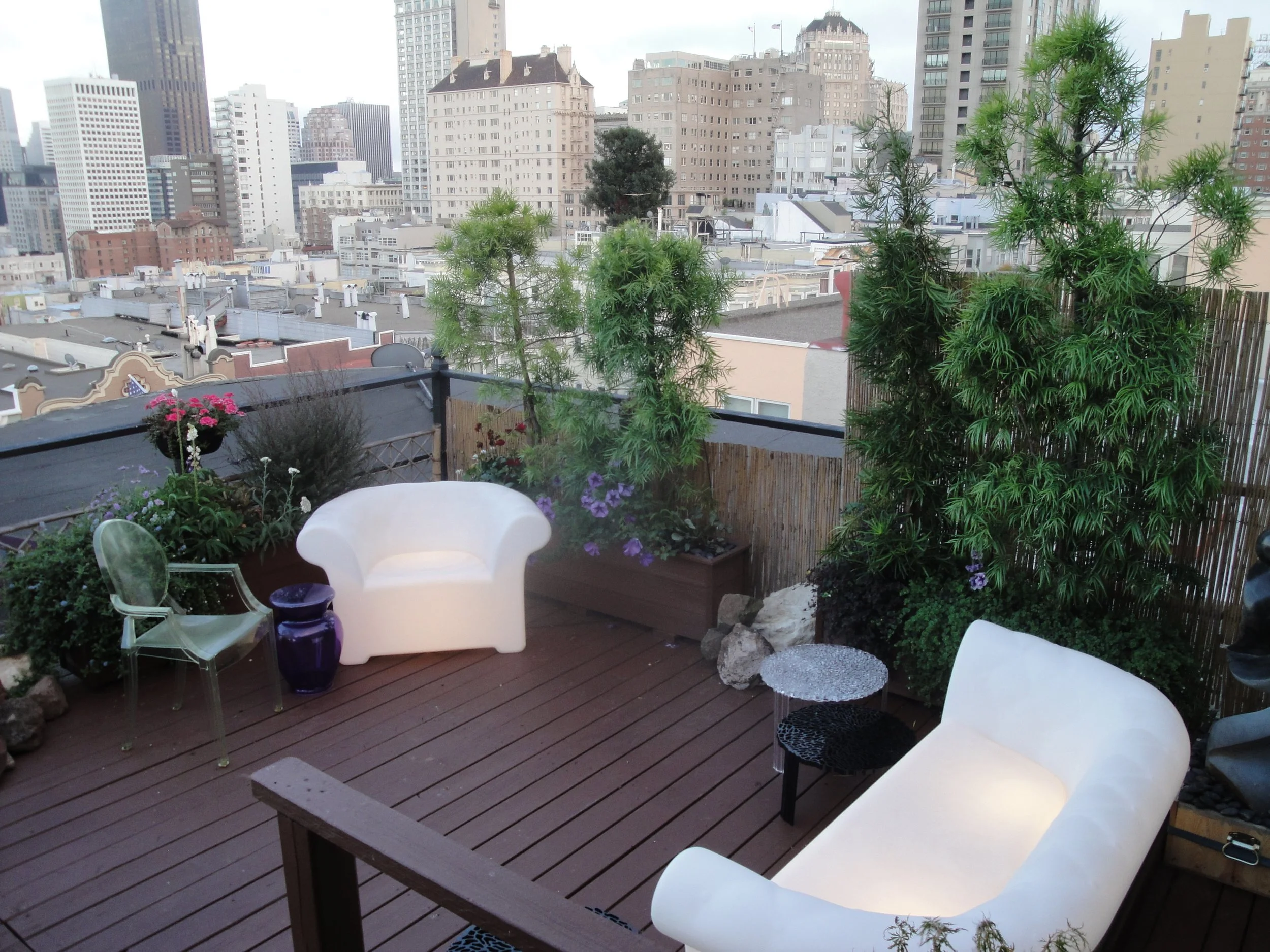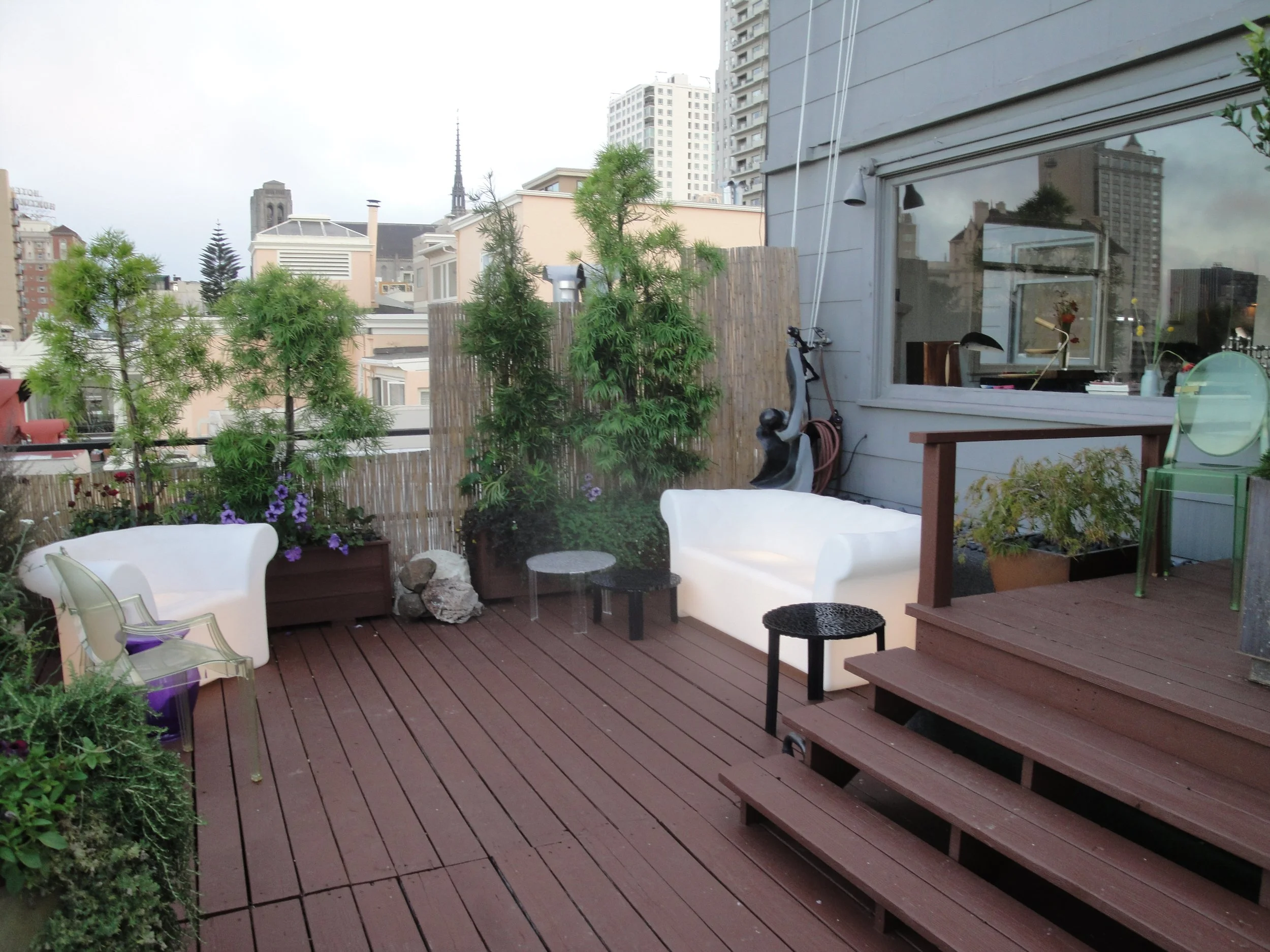 It turned out this 1916 Edwardian building on Taylor St had an entire cottage built on top of it sometime in the 1930s that was practically like a house, just on top of a building, with a deck in front and a patio in back, that the rooms all opened onto. I moved up there and turned the deck and patio into a planter garden with fake grass that made it practically a full garden.